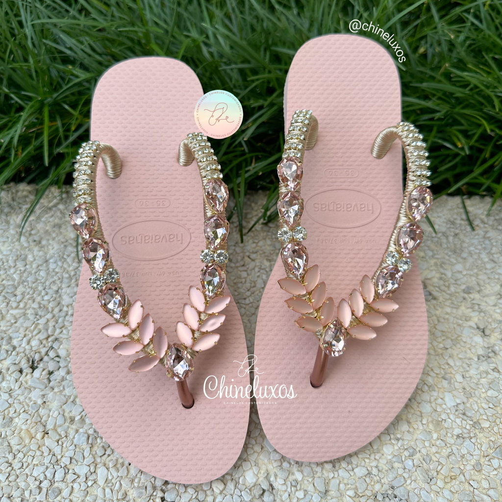 Havaianas SABRINA, no modelo slim na cor rosa ballet, com cabedal envolvido com fio de seda na cor rosa e manta de strass dourada com acabamento impecável.